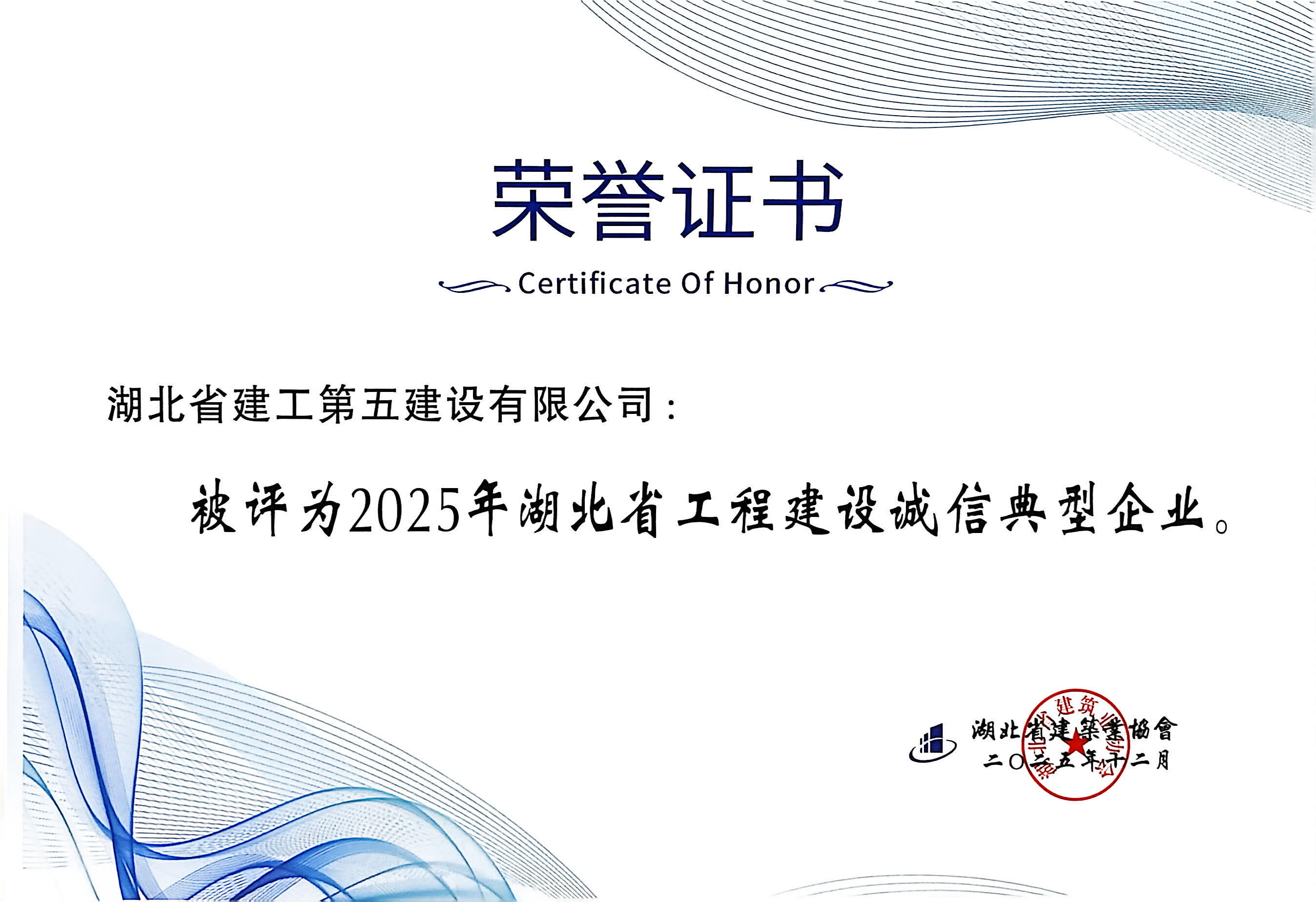 - 2025-12-29湖北省建工第五建設(shè)有限公司榮膺省級(jí)“工程建設(shè)誠(chéng)信典型企業(yè)” 獲得AAA級(jí)...[圖]